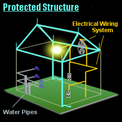 Tanpa jalan yang ditunjuk untuk mencapai tanah , sambaran petir dapat memilih untuk bukan menggunakan konduktor apapun yang tersedia di dalam rumah atau bangunan . Ini mungkin termasuk telepon , kabel , atau jalur listrik , air atau gas pipa , atau ( dalam kasus bangunan berbingkai baja ) struktur itu sendiri . Petir biasanya akan mengikuti satu atau lebih dari jalur ini ke tanah , kadang-kadang melompat melalui udara melalui flash sisi untuk mencapai konduktor yang lebih baik beralasan ( menonton animasi di atas ) . Akibatnya , petir menyajikan beberapa bahaya untuk setiap rumah atau bangunan :Api - Api dapat mulai di mana saja yang terkena kontak saluran petir , menembus atau mendekati bahan yang mudah terbakar ( kayu, kertas , pipa gas , dll) di gedung - termasuk kayu struktural atau isolasi di dalam dinding dan atap . Ketika petir berikut kabel listrik , sering akan terlalu panas atau bahkan menguap kabel , menciptakan bahaya kebakaran di mana saja di sepanjang sirkuit yang terkena dampak .